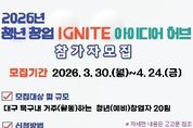 영남연합포커스 김종설 기자 | 대구 북구청은 지역 청년들의 창업 열정과 혁신적인 아이디어 발굴을 지원하기 위해 오는 4월 24일까지 '청년 창업 Ignite 아이디어 허브' 참가자 20팀을 모집한다. 이번 사업은 지역 청년 (예비)창업자들이 보유한 창업 아이디어에 ‘점화(Ignite)’의 계기를 제공하여 사업화 가능성을 구체화하고 현실화할 수 있도록 단계별로 지원할 예정이다. 참가 대상은 2026년 청년놀이터 멤버십 회원 또는 창업놀이터 입주기업, 현재 39세 이하(1986년 3월 31일 이후 출생)인 북구 지역 청년 (예비)창업자이다. 북구 거주자․북구 소재 기업 재직자․북구 소재 대학생(휴학생)․북구 관내 창업 3년 미만 기업 중 1개 이상 요건을 충족하면 참가할 수 있으며, 이메일로 신청하면 된다. 선발된 팀에는 월 2회 이상의 협업 공간 이용 지원, 팀당 활동비 50만 원이 지원되며, 성과발표회를 통해 상위 7팀에는 총 310만 원 규모의 시상금이 수여될 예정이다. 배광식 북구청장은 “청년이 가진 아이디어 하나가 미래를 밝히는 불꽃이 될 수 있도록 지속적으로 청년이 도전할 기회를 제공하고 대