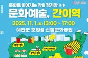 영남연합포커스 김진우 기자 | (재)예천문화관광재단은 11월 1일 예천군 호명읍 산합문화공원(걷고싶은 거리)에서 ‘문화예술, 간이역’ 10월 프로그램을 개최한다. ‘문화예술, 간이역’은 문화체육관광부와 지역문화진흥원이 주관하고, (재)예천문화관광재단이 주최하는 ‘2025 문화가 있는 날 구석구석 문화배달’ 사업의 일환으로, 일상 속에서 문화를 자연스럽게 접하고 다양한 문화 향유 기회를 누릴 수 있도록 기획된 지역 밀착형 프로그램이다. 이번 프로그램은 9월에 이어 두 번째로 진행되는 야외형 문화행사로, 단풍으로 물드는 가을 정취 속에서 다채로운 공연과 체험이 어우러진 프로그램으로 구성됐다. 주요 프로그램으로는 싱어송라이터 ‘어치브’와 ‘퓨전국악 이어랑’이 함께하는 청춘콘서트, 가족 단위 관객을 위한 마술과 버블쇼, 환경문제 인식을 높이는 체험형 콘텐츠 ‘리사이클 정류장’, 감성을 자극하는 독서 프로그램 ‘북적북적 북크닉’이 준비된다. 특히 이번 북크닉에서는 예천 출신의 그림작가 송태고 작가와 함께하는 북 토크 콘서트와 클레이 체험 프로그램도 함께 진행되어 지역 예술가와의 교류를 통해 문화적 의미를